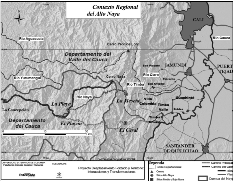 El mapa 5 muestra el contexto regional del Alto Naya donde se ubican lugares de referencia física y simbólica para la población como el Cerro Naya, donde además nace el rio Naya que otorga el nombre a toda la región; el sitio el Playón y la Playa desde donde parten los caminos para salir de la apartada región montañosa donde habitaban hacia los centro rurales El Ceral y La Meseta. Se ubican igualmente los centros urbanos más importantes para el comercio como Cali, capital del Departamento del Valle y el municipio de Jamundí, y el municipio de Santander de Quilichao en el Departamento del Cauca.