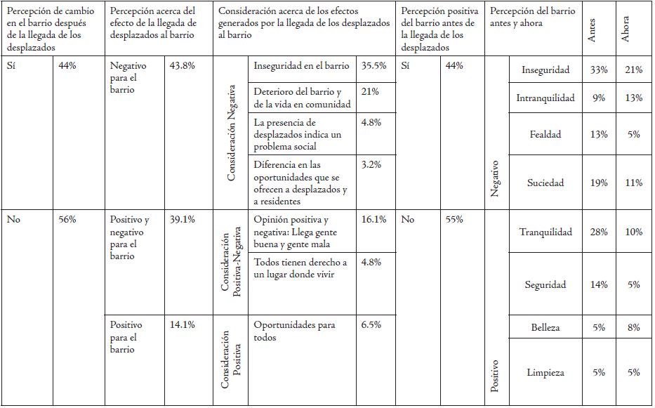 De los encuestados, el 44% estima que la llegada de los desplazados trae sólo consecuencias negativas para el barrio, como el aumento de la inseguridad y el deterioro del barrio; sólo un 3.2% de los encuestados menciona problemas generados por oportunidades diferentes ofrecidas por el Estado y las organizaciones no gubernamentales a desplazados y a personas ya residentes en el sector. No obstante, en las conversaciones que acompañaron las entrevistas, muchos antiguos residentes manifestaron que era injusto que los desplazados recibieran lo que para ellos es difícil de acceder, es decir, que los residentes antiguos tienen menos facilidades de acceso a programas de reducción de la pobreza. Reconocen que los desplazados requieren una atención especial, pero ello no debería impedir que las ayudas también beneficien a personas en condiciones similares de precariedad. Con mucha frecuencia los entrevistados manifestaron reserva y desconfianza respecto a la autenticidad de la condición de desplazado de sus vecinos. Para muchos de ellos, entre los desplazados por la violencia se camuflan muchos que vinieron a la ciudad en busca de mejores opciones de vida. Llama la atención que ante un fenómeno multicausal como la migración forzada por la violencia, predominen visiones dicotómicas respecto a quien es realmente un auténtico desplazado, sin ningún tipo de matiz entre estas dos posiciones extremas.