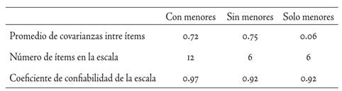 Se estimó el coeficiente para dos encuestas 2015 y 2010. En el cuadro 1 se muestran los resultados con valores de Cronbach 0.92, solamente válidos cuando no se incluye a menores de edad, o sea, solo se considera a mayores de edad. La aplicación a la encuesta 2010 arrojó resultados muy cerca de 1, por lo que no se incluye en este trabajo (para un desarrollo completo de la metodología véase Castro, 2016).