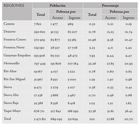 Era de esperarse que a mayor concentración de población por región, esta reflejara el mismo peso relativo de la población en pobreza alimentaria por ingreso; sin embargo, la región Yaqui-Mayo adquiere el primer lugar con 36.41 %, muy por arriba de la región Hermosillo, que concentra a 20.95 % de sus habitantes en esta condición, cuando es la que reúne 32.26 % de la población total en el Estado; no obstante, las regiones Desierto, Frontera Centro, Guaymas-Empalme y Frontera Norte conservan esa representatividad y ese orden jerárquico poblacional, al igual que las de Centro, Sierra, Río Altar, Sierra Alta, Río San Miguel y Sierra Baja con menor representatividad y se enlistan de menor a mayor, con respecto a la población en pobreza e inseguridad alimentaria.