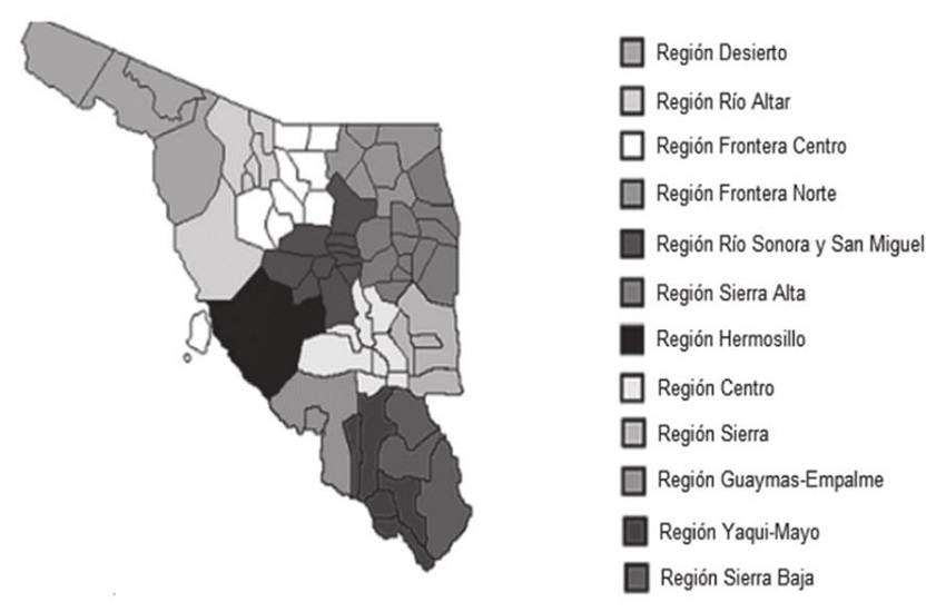 La entidad se divide en 12 regiones (Camberos et al., 1996), a saber: