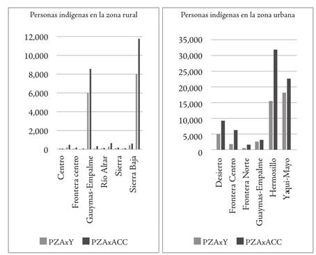 No es de sorprender que en la figura anterior se registre una mayor escala poblacional en la zona rural (a la izquierda) que la urbana (de la derecha); porque las regiones Yaqui-Mayo y Guaymas-Empalme, con una gran zona rural, son el asiento del mayor grupo indígena: la tribu yaqui, seguida por los mayos. Estas dos regiones comprenden 90.85 % y 86.51 % de personas en pobreza alimentaria por ingreso y acceso, respectivamente, mientras que las regiones meramente rurales (Centro, Río Altar, Río San Miguel, Sierra, Sierra Baja y Sierra Alta) representan 7 % y 8.2 % de la población en pobreza alimentaria por ingreso y acceso.