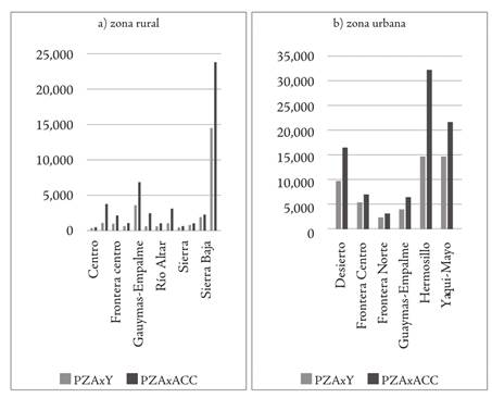 En la zona urbana, la región Yaqui-Mayo figura en primera posición, seguida por Hermosillo, Guaymas-Empalme, Desierto, posteriormente Frontera Centro y en último lugar la región Frontera Norte; este orden se mantiene tanto para la PZAxY como para la PZAxACC. Ya poseemos el conocimiento a priori de que en estas regiones coexiste población en la zona rural, la cual en su conjunto representa 98.52 % y 98.16 %, respectivamente, para cada dimensión de pobreza alimentaria, manteniendo el mismo orden jerárquico regional.