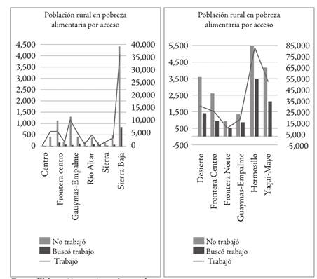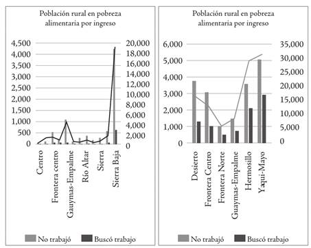 Al hacer nuestro análisis por zonas, en la figura 2 se observa la zona rural en pobreza alimentaria por ingreso con cerca de 94 879 personas, con 36.83 % de personas que sí trabajaron (pero que no les alcanzó el ingreso para adquirir la canasta alimentaria), 9.08 % que no lo hicieron y 1.46 % que buscaron empleo dentro de la zona rural sonorense, siendo la región Yaqui-Mayo la de la mayor cantidad de individuos que aunque trabajaron, se encuentran en pobreza alimentaria.