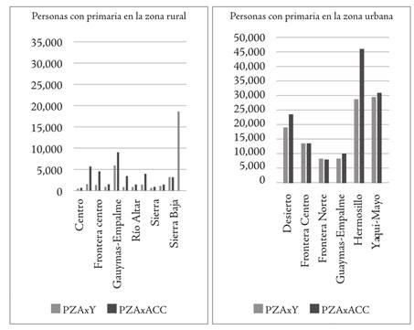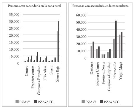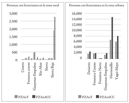 Las personas con preparatoria inmersas en dicha problemática representan 15.52 % por ingreso y 13.13 % por acceso, y su distribución regional se repite como en las dos anteriores (figura 6); aunque referida a una población de menor magnitud en la zona rural, la región Yaqui-Mayo destaca nuevamente (con 10 544 habitantes en PZAxACC y 8 370 en PZAxY) en el primer lugar; también encontramos la de Sierra Baja como la de mayor participación en las regiones exclusivas del área rural.