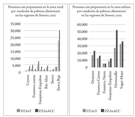 En la página anterior (en la figura 6) se señalan las regiones urbanas. La de Hermosillo encabeza la lista con personas en pobreza alimentaria por acceso con preparatoria, seguida por las regiones del Yaqui-Mayo, Desierto, Frontera Centro, Guaymas-Empalme y Frontera Norte; mientras que las personas en pobreza alimentaria por ingreso la lidera la región Yaqui-Mayo, seguida por Hermosillo, Desierto, Frontera Centro, Frontera Norte y Guaymas-Empalme, respetando el orden acostumbrado de mayor a menor. Se pone énfasis en que la región Yaqui-Mayo de manera conjunta (urbana y rural) contiene poco más de 29 000 personas en PZAxACC y alrededor de 24 000 en PZAxY.