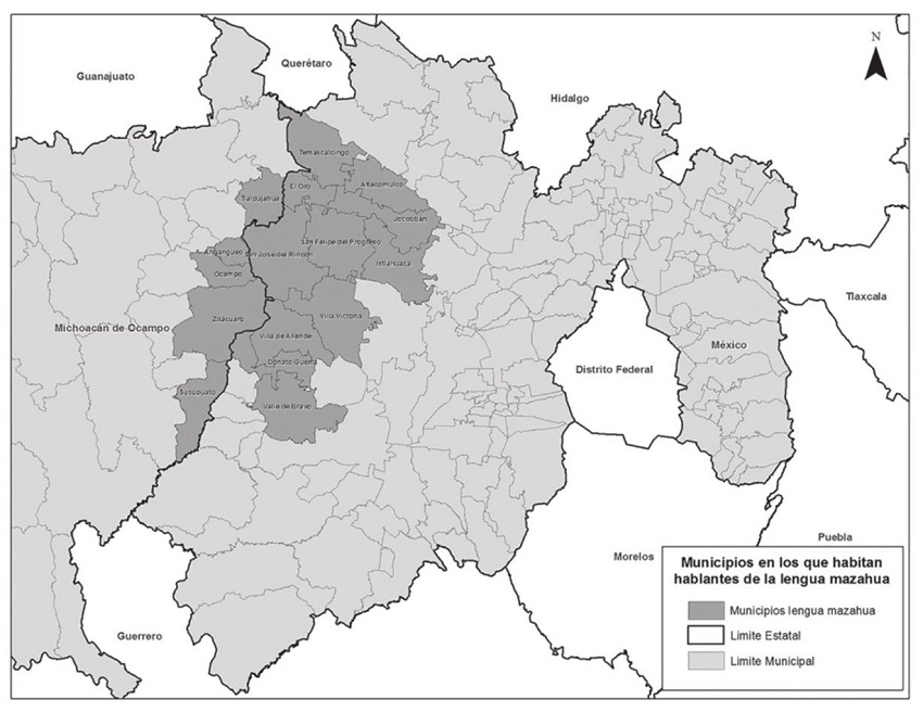 Considerando que las regiones se construyen con criterios científicos que dan cuenta de realidades empíricas (Santos, 2000: Fábregas, 2010: Lindón y Hiernaux, 2006), es arriesgado asegurar que existe una región mazahua considerada exclusivamente desde el criterio cultural4. Partiendo del componente histórico hay muestras de que en esta región habitaron siempre los mazahuas (Hernández, 1988: Ixtlilxochitl, 1985: Quezada, 1996: García Castro, 1999: Carrasco, 1985: Van Zantwijtk, 1969), pero es evidente que el proceso histórico establece cruces simbólicos que complica construir regiones pensando monolíticamente a la cultura, prueba de ello es el periodo de la Colonia que incorpora elementos culturales ( Jarquín y Herrejón, 1995) o incluso relaciones de poder asimétrico entre grupos, lo que le da su carácter a las regiones, como argumentaba Aguirre Beltrán sobre las regiones de refugio (1973). Llegar a un criterio cultural para hablar de regiones indígenas es difícil, pero me parece necesario cuando se trata de ubicar la pertinencia del lugar como emblema característico de una sociedad en particular, de ahí que sea el criterio de permanencia histórica lo que quiero se me permita establecer, pragmáticamente, como región mazahua. No significa que sea una región cultural monolítica, significa que el proceso de existencia histórico del pueblo mazahua ha tenido que transfigurarse, en el sentido de Bartolomé (2006), para persistir cambiando. De ahí que, con esta salvedad, permítame el lector decir que históricamente la región mazahua se asienta en los actuales municipios mexiquenses de Donato Guerra, Valle de Bravo, Villa de Allende, Villa Victoria, Ixtlahuaca, Jocotitlán, San Felipe del Progreso, Atlacomulco, El Oro, San José del Rincón y Temascancingo; además de los municipios de Susupato, Tlalpujahua, Angangueo, Zitácuaro y Ocampo en el estado de Michoacán. La imagen 1 ilustra esta región histórica de los mazahuas.