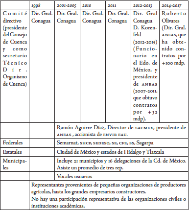 La captura de los espacios de decisión bajo el modelo de cuenca por parte del sector privado (empresariado) se realiza no solo a través de contratos millonarios, también participa en las altas escalas de la burocracia del agua y controla la mayor parte de las representaciones de los distintos usos del agua en el Consejo de Cuenca del Valle de México.8 Como muestran los cuadros 1 y 2, este control ha sido paulatino y se ha valido también del espacio judicial, donde la elite político-empresarial del Estado de México impulso entre 2004 y 2008 una demanda contra la Conagua y el Gobierno de la Ciudad de México que, como señala González (2016: 197), “la disputa respondió a un proceso articulado por las acciones de una elite política y una burocracia estatal que rebasaba las coyunturas electorales y respondía a una racionalidad geopolítica transexenal”. Es así que las decisiones sobre el agua, cuyo espacio de legitimación está representado en los Consejos de Cuenca, están directamente relacionadas con el poder político y al negocio que representa el abasto de agua para la gran urbe.