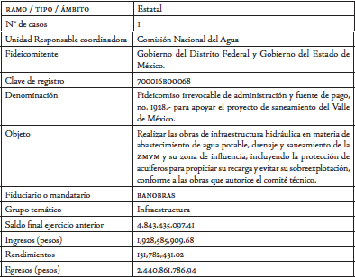 Esta íntima relación entre abasto de agua y construcción de infraestructura se ha concretado mediante recursos federales, locales e internacionales, pero de los que no se tiene información pública suficiente, como ocurre con el Fideicomiso 1928, para apoyar el saneamiento en el Valle de México, constituido en 1996 por BANOBRAS, la Secretaría de Hacienda y Crédito Público y la Semarnat-Comisión Nacional del Agua como fiduciarios, capaces de recibir aportaciones de entes privados extranjeros y locales, y como fideicomitentes los gobiernos de la Ciudad de México y del Estado de México. Este instrumento ha sido clave en el otorgamiento de licitaciones de obra pública cuyos pormenores no han recibido la publicidad debida.7 La fiscalización de los fideicomisos en México ha sido tema de un fuerte debate público, gracias al cual se ha logrado un conocimiento parcial sobre la forma de ejercer los recursos. En 2015, la SHCP dio a conocer cifras sobre fideicomisos que informan de la magnitud de los recursos que maneja el fideicomiso en cuestión, cuyos balances registraron rendimientos por más de 132 000 millones de pesos (cuadro 2), para aquel año.
