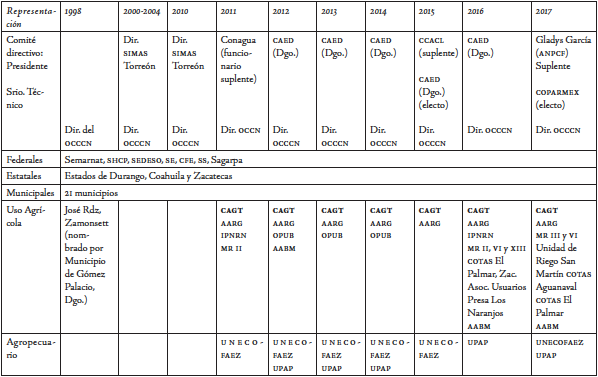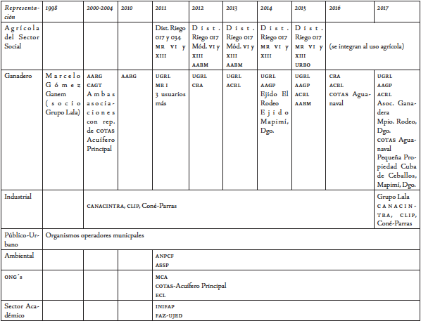 AABMAsociación de Agricultores del Bolsón de MapimíAGLRGAsociación Ganadera Local de Río Grande, Zac.UNECOFAEZUnión de Ejidos y Comunidades Forestales y Agrícolas Emiliano ZapataUPAPUnión de Productores Agrícolas de ParrasURBOUnidad de Riego Benjamín OrtegaOPUBOrganización de productores unidos de los BajíosSPRNPSociedad de Producción Rural de Nuez de Parras, Coah.Rep. de Ambientalistas/académicos