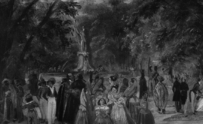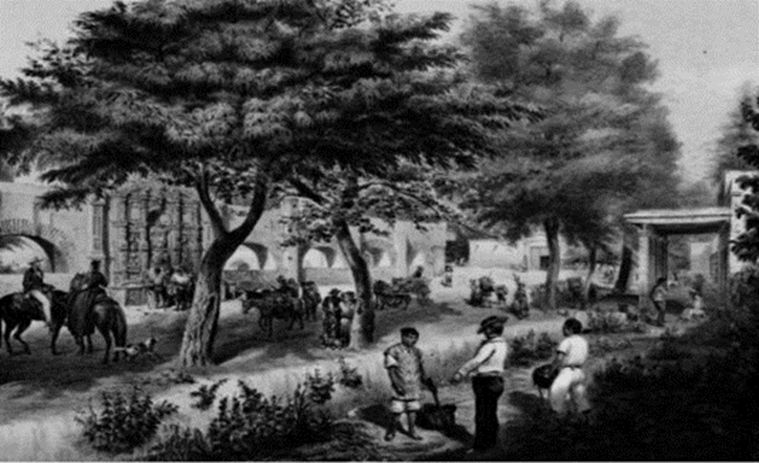 [si bien] esta construcción no se distingue por su belleza arquitectónica, sirve para animar la escena; por un lado el sólido acueducto, cuyos arcos a manera de grandes lentes dejan ver a lo lejos paisajes tranquilos y risueños; la fuente con sus adornos grotescos donde se acercan algunos indígenas a apagar la sed, vestidos con sus curiosos trajes; el indio que pasa lentamente con su hijo a cuestas y arreando sus jumentos cargados de verduras; ora se detiene gallarda joven en su brioso corcel con el caballero que la acompaña, a contemplar los indios carboneros que vienen; el ruidoso carro de harina que cruzó, dejando una nube de polvo; todo, todo presenta vida, movimiento y alegría. Allá en el fondo se contempla el Panteón de los ingleses, contrastando su fría calma con la animación exterior; unos frondosos árboles y algunas casas sencillas vienen a completar el cuadro (Arróniz, 1855: 6; las cursivas son nuestras).
