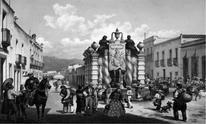 A la salida de la capital, por el noroeste, en la calzada de San Cosme, se encuentra la Fuente llamada de la Tlaxpana […] Nada tiene de monumental, y parece a primera vista más bien recuerdo de alguna antigüedad mexicana que una obra construida por los españoles; se ven algunos adornos del gusto de la época; figuras con instrumentos de cuerda, bajos y violines, y las armas de la casa de Austria: dos inscripciones nos dicen que fue construida en 1737, siendo arzobispo y virrey de la Nueva España D. Juan Antonio Bizarrón y Eguiarreta. Dicha obra pertenece al género a que ha dado su nombre por lo extravagante y atrevido el conocido Churriguera, que viene a ser el Góngora de la arquitectura. Y advertiremos de paso, que en México, construidos los edificios principales, poco más o menos en una misma época, adolecen de unos mismos defectos en su gusto arquitectónico (Arróniz, 1855: 6; las cursivas son nuestras).