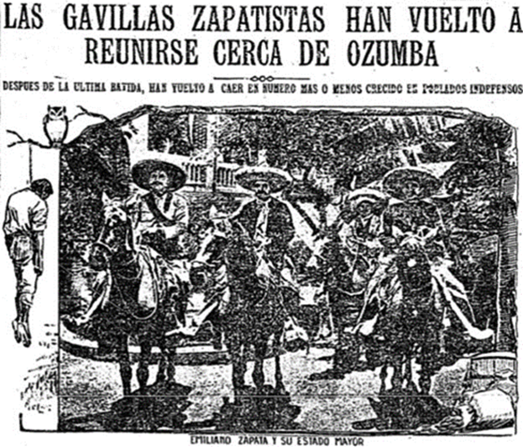 En este contexto se consolida la nota roja, un formato que sirvió para distraer a la población de los problemas capitales (Castillo, 2005: 106; Mraz, 2009: 45). Cuando irrumpe la Revolución, la nota roja se halla en su momento más rentable y productivo, y encuentra en el conflicto armado un campo rico en imágenes e historias que se ajustan a sus necesidades discursivas. De entrada, pues, el campesino mexicano -ese que capturan las litografías de la Revista Científica y Literaria de México o que ocupa su humilde lugar en vistas panorámicas como “La Fuente del Salto del agua” de México y sus alrededores- es tratado por el discurso periodístico como un criminal, pues ha puesto sus habilidades al servicio de “cabecillas latrofacciosos”. Lo más interesante de este tratamiento es que tensiona la imagen y la palabra, en este caso la fotografía y el texto noticioso en el que se inserta. Véase como ejemplo una nota aparecida el 26 de agosto de 1912 en El Imparcial, que, mediante la yuxtaposición de fotografía y grabado, más un discurso verbal abiertamente hostil, consigue construir un retrato de Zapata y su Estado Mayor con acentos violentos y tétricos: