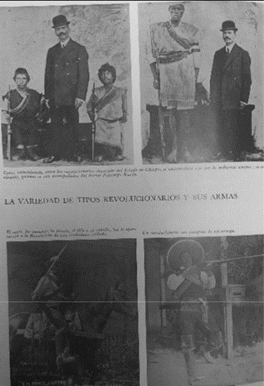 La concepción de los campesinos armados como tipos populares, que opera a partir del reconocimiento y la abstracción de una indumentaria, una pose y una gestualidad afines, permite proyectar la Revolución como un movimiento homogéneo y poseedor de unidad. Esto es muy notorio en la página titulada “La variedad de tipos revolucionarios y sus armas”, donde el indígena aparece como un soldado más de la Revolución. Llama la atención, de entrada, la elección de dos indígenas enanos y uno gigante para representar el rostro del elemento autóctono, lo cual corrobora la visión citadina de lo indígena, proclive al encuadre exotista. Esta decisión, aunada a la ausencia de texto descriptivo-explicativo, colabora en la simplificación de las complejas y contradictorias relaciones entre las comunidades indígenas y las distintas facciones que compusieron la Revolución. Es claro que de una página llamada “La variedad de tipos revolucionarios y sus armas” no puede esperarse un análisis de las tensiones más o menos subterráneas entre culturas de una misma nación, sino una taxonomía pintoresquista.