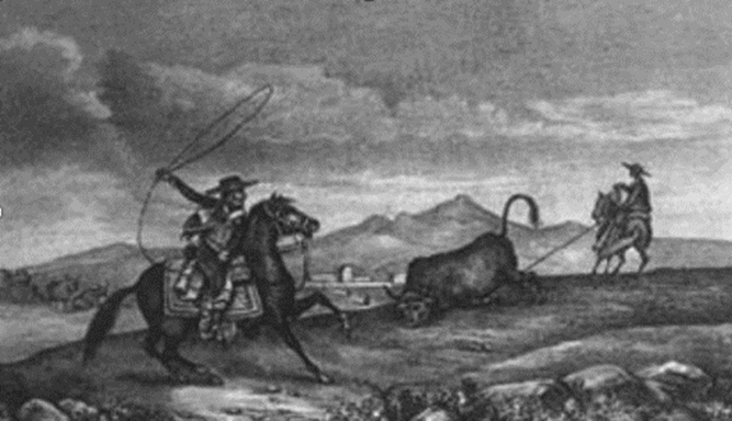 En ella, tanto el narrador como el litógrafo, luego de representar la vasta y fecunda naturaleza mexicana, se centran en los vaqueros (o peones o rancheros) y el lazado de la res. Empero, lo destacable es que escritor y litógrafo tienen la capacidad y la sensibilidad suficientes para describir verbal y plásticamente las características y los detalles del traje y los arreos de los trabajadores del campo, la decisión, ligereza y elegancia de los jinetes, la tensión de las cabalgaduras, jugando incluso con el escorzo de la caída del bruto.