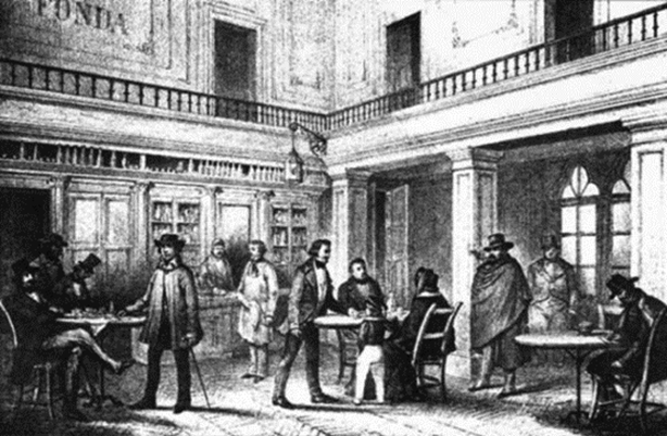 Otro tanto pudiera decirse del ensamble literario-litográfico “Interior del Café del Progreso”, publicado en 1851 en La Ilustración Mexicana, con el que se dibuja la importancia que en la vida cultural del México decimonónico iba adquiriendo la cafetería como espacio-tiempo de la socialización burguesa. La parte literaria fue escrita por Fernando Orozco y Berra, desconociéndose el autor del dibujo: