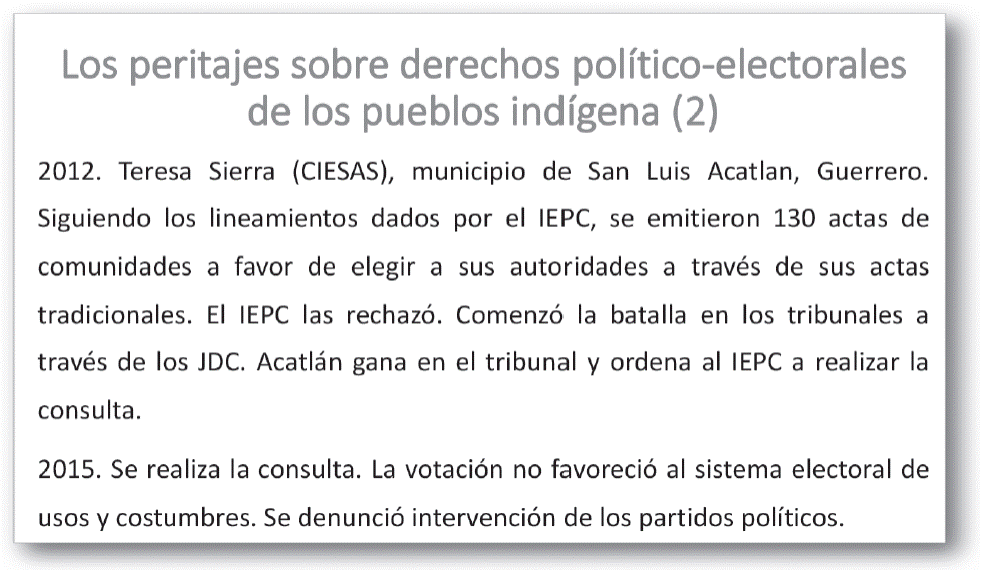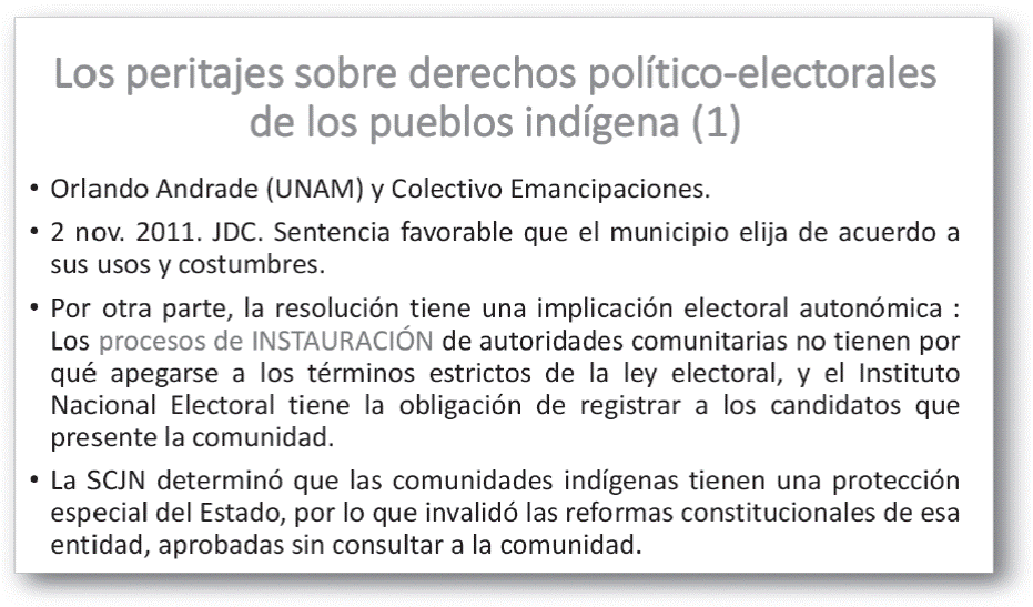 Podemos decir que el peritaje antropológico es un dictamen emitido por un conocedor o experto en la cultura de los «otros», en este caso, de los indígenas, dentro de un proceso jurisdiccional y que puede ser solicitado por el juez o las partes para demostrar algún punto de la litis. Se convierte en un medio de prueba cuando es solicitado por el juzgador o por una de las partes actoras en un procedimiento judicial (y es cuando lo llamamos peritaje), sobre todo de carácter penal aunque también se ha utilizado en materia agraria, por lo que respecta a la paleografía de documentos precoloniales y coloniales, en los cuales los pueblos sustentan la propiedad de sus tierras-, y en últimas fechas en materia electoral. En el caso de Oxchuc no es peritaje porque aunque se elabora y presenta en cumplimiento de una resolución judicial, ya no forma parte de las pruebas del juicio. A continuación exponemos un resumen de lo que han sido los peritajes antropológicos en materia electoral en México: