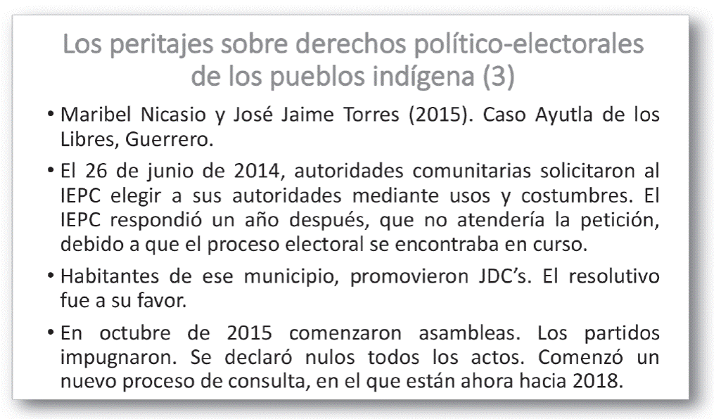 Los Acuerdos de San Andrés de 1996 fue el primer intento de aterrizar esos derechos, seguido por los reclamos por parte de los indígenas en materia electoral en otros estados de la república mexicana. En algunos casos esos reclamos por vía jurisdiccional han provocado sentencias adversas o a favor, o bien, tensiones por los cambios que implican en las dinámicas de relación entre el Estado mexicano y los pueblos indígenas en lo local. En el caso chiapaneco se localiza la tensión, por un lado, entre el afán del gobierno del estado de Chiapas de sostener poderes locales (caciquiles o de facto), y por otro dar cumplimiento al Sistema Internacional de Derechos Humanos que abarca los derechos civiles, políticos, económicos y culturales de los indígenas, y que están reconocidos en la Constitución (CPEUM).