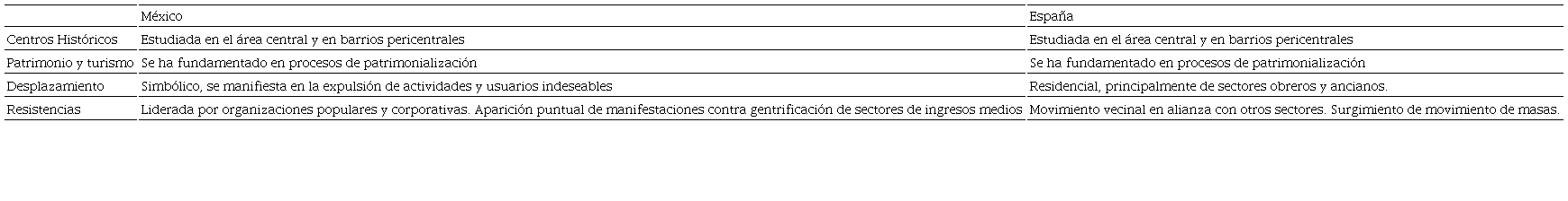 La discusión anterior ha servido para mostrar la manera en que la gentrificación se fue introduciendo en la academia hispanohablante y las dudas que ha ido generando, así como las posturas que se han tomado con respecto a su pertinencia para ser utilizada en los ámbitos locales. A continuación presentaremos un ejercicio comparativo de los abordajes de la gentrificación entre España y México, ya que se considera que entre ambos países existen vasos comunicantes que datan de varios siglos atrás, por lo que existen ciertas similitudes en el espacio urbano que responden a procesos globales, pero sin dejar de reconocer las particularidades y el contexto de cada uno. Asimismo, hay una nutrida comunicación entre redes académicas que permite indagar sobre la cuestión urbana y entender la manera en que un concepto trasatlántico como la gentrificación se expresa en ambas realidades.
