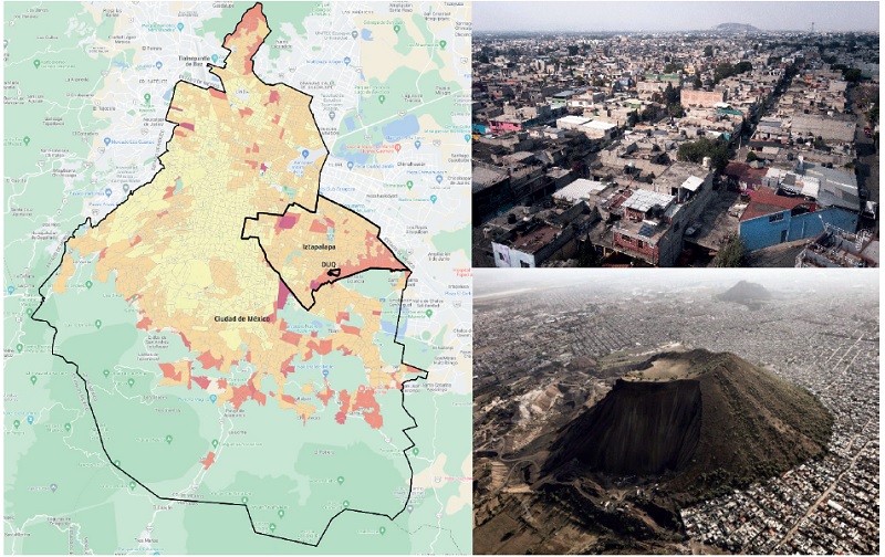 Específicamente problematizo el sentido de comunidad y pertenencia entre los jóvenes de un barrio criminalizado en la periferia oriente de la Ciudad de México. Analizo la colonia popular Desarrollo Urbano Quetzalcóatl (DUQ o ‘La Desarrollo’, tal como es reconocida) en la zona desfavorecida del sur de la alcaldía Iztapalapa, en las faldas del volcán Xaltepec (devorado por la explotación minera) y límite de la mancha urbana (figura 1). Entre las características de la zona destacan fuertes carencias sociales, altos índices delictivos, tráfico de drogas y hostigamiento policial de los jóvenes (Moncrieff, 2021). En el siguiente mapa se aprecia la localización de DUQ y su mayor grado de rezago social con respecto a otras áreas de la Ciudad de México en términos de salud, vivienda, servicios públicos y educación (CONEVAL, 2020). ‘La Desarrollo’ es considerada “lo peor” y “la más peligrosa” colonia de Iztapalapa. Los medios de comunicación la han difamado como “infierno social” por sus altos índices delictivos y la alarmante penetración del tráfico de drogas.3 En 2019, la Guardia Nacional (GN) inauguró aquí su operación en la ciudad,4 a fin de hacer descender los mencionados índices de criminalidad en un trabajo conjunto con la policía.