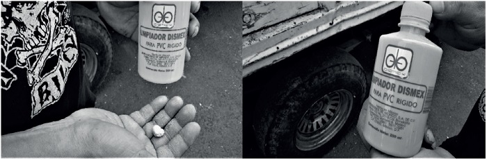 Con Marco (22) conocí una de estas monas. Su familia lo echó de la casa, según él, “por problemático”, ya que solía aspirar el gas de solventes en una mona. Vivía en la calle y en su soledad compraba tíner en la tlapalería a un precio muy bajo. Esta manera de drogarse es bastante cotidiana entre algunos jóvenes, puede incluso adquirirse el compuesto (el activo) preparado con saborizantes de chocolate, vainilla, frutas, etcétera.11 Es un mexicanismo complejo, pero la mona es el nombre del pedazo de papel o estopa que se humedece con tíner, PVC u otros solventes. Monear(se) es drogarse con la mona (con la muñeca de trapo o con la muñeca) e implica inhalar el gas que despiden estos químicos. Su consumo produce intoxicación, destacándose la visión borrosa, los mareos y son frecuentes los temblores (muy evidente en los párpados). Altera el habla, actúa en los mismos nervios y causa euforia: “es para sentirse indestructible, olvidarse de la vida, carnal” (Marco). Cuando alguien se monea, utiliza las manos para acercarse estos vapores tóxicos a la nariz y la boca. Para pedir un toque, dicen jocosamente “saca las muñecas” y hacen el ademán respectivo.