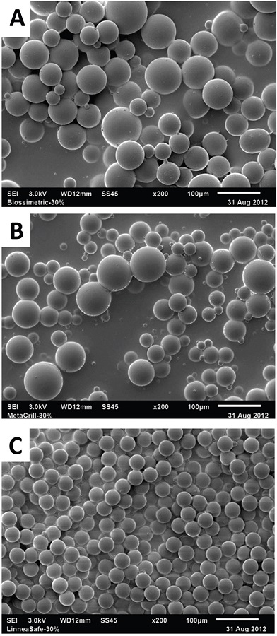 Piacquadio, Smith and Anderson (2008)17 also compared, using SEM, different PMMA commercialized brands to determine whether there are significant differences between these products, including the Metacrill, which was also analyzed in this study. Significantly morphologic differences were revealed, mainly on the size of microspheres of these polymers, leading the authors to conclude that the variability observed between these products may result in different therapeutic outcomes, especially regarding the safety of the patient. For this reason, they were able to infer that doctors and health care professionals should be aware that the products that are "comparable", and often considered to be similar, may not be equal.