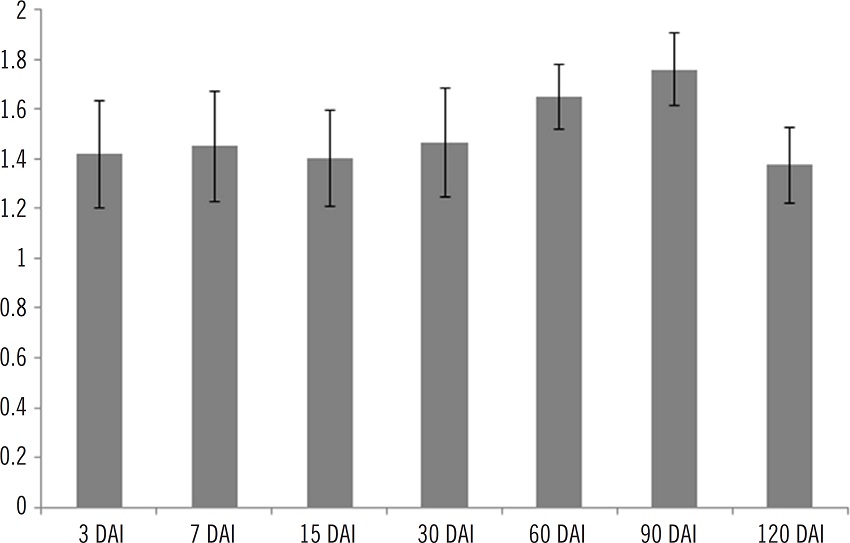 Linnea Safe® PMMA microspheres were not found in the ten cuts of viscera (liver, popliteal lymph nodes, spleen, kidneys and lungs) in any groups throughout the analysis period. There were no PMMA microspheres in popliteal lymph nodes, but it was observed reactional aspect of this organ in the early stages of the study. There was no difference between the weights of the paws that received the implant and the other contralateral of the same animals during the study period (Figure 3).
