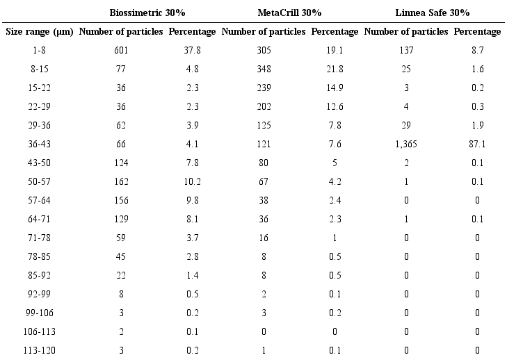 After the morphometric analysis of the PMMA microspheres of three different brands, it was found that the majority (37.8%) of the microspheres diameter of the Biossimetric® brand (30%) is between 1-8 µm, only 4.1% is between 36-43 µm, and 36.7% of the diameter is larger than 50 µm. The analysis of the Metacrill® (30%) brand showed that 76.1% of their PMMA microspheres diameter is between 1-36 µm, 7.6% is between 36-43 µm, and 16.3% is larger than 43 µm. Unlike the two brands previously analyzed, Linnea Safe® (30%) presented with a more homogeneous appearance and highly concentrated microspheres, where 8% of microspheres diameter is between 1-8 µm, 87.1% between 36-43 µm, and only 0.3% is larger than 43 µm (Figure 1 and Table).