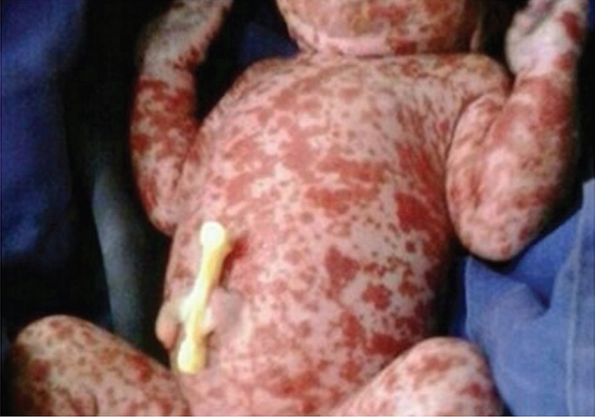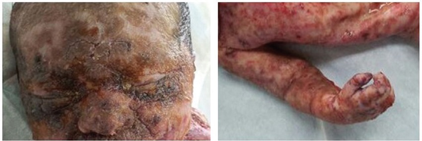Newborn, 4 days following birth, male, prenatal with no particularities, normal delivery at 38 weeks of gestation, weighing 3.3 kg at birth and Apgar score 8/9, with reddish plaques diffusely distributed throughout the body from the birth (Figure 1). He was admitted in IMIP at the fifth hour of life with reddish, multiform, raised skin lesions on the face, trunk, limbs and palate. Some lesions have evolved with desquamation, becoming friable, with formation of crusts. Complete blood count (CBC) and coagulation profile were normal; chest X-ray showed bilateral diffuse infiltrate with normal heart area. The patient evolved to death, still under investigation, without diagnosis definition, was referred to the SVO for autopsy.
