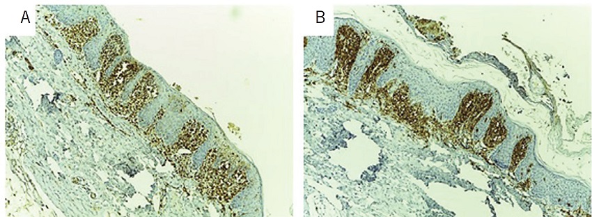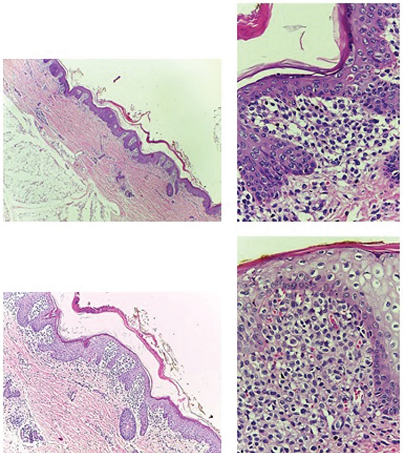 Skin lesions have shown great variability, and are more commonly found in multisystemic presentation, with the presence of multiple pink-yellowish papules on the trunk, face and scalp, simulating seborrheic dermatitis6. Histologically, the infiltrate is composed of dense aggregates of histiocytes with reniform or indented nucleus and eosinophilic cytoplasm, some cells containing Birbeck granules (observed under the electron microscope), permeated by eosinophils. In the skin, histiocytes can infiltrate the epidermis, developing a pagetoid pattern. The cells express immunophenotyping of Langerhans cells, positively labeled for S100 and CD1a antigens7.