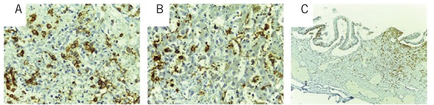 An immunohistochemical study was performed with the markers for the Langerhans cells (CD1a and S100), with positive labeling on dermis suspected cells (Figure 5) and on other organs previously mentioned (Figure 6), confirming the diagnosis of multisystemic LCH - Letterer-Siwe disease.