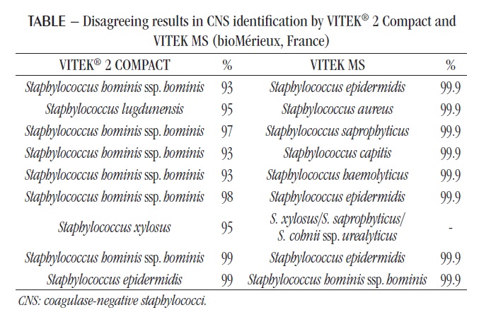 Spanu et al. (2003)(14) demonstrated that VITEK® 2 Compact identified correctly 90.5% of CNS and clearly indicated there is still necessity of improvement in the identification of some species by the phenotypic method, especially in S. hominis. isolates. This fact can explain discrepancies observed in our study, in which S. hominis appears in seven out of the nine disagreeing isolates.