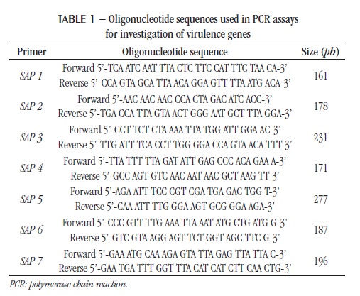 The most studied hydrolases related to Candida virulence are proteases, phospholipases, and lipases. Secreted aspartyl proteinases (Sap) form a family of 10 isoenzymes (Sap1-10) that participate in the infection process by degrading several host cell proteins, such as immunoglobulins, proteins of the complement system and extracellular matrix, contributing to tissue damage and the resulting invasion by the microorganism(18-21). These enzymes play different roles depending on the environmental stimuli and are involved in the host inflammatory response to fungus. The activation of these proteins is a well-regulated process at specific time points, what increases the infection potential of C. albicans(6, 16, 22, 23). Among the SAP gene family, the most frequently studied in the literature and associated with pathogenicity of C. albicans are SAP1-7 genes. The objective of this study was to evaluate the presence of these genes in vulvovaginal C. albicans cell lines.