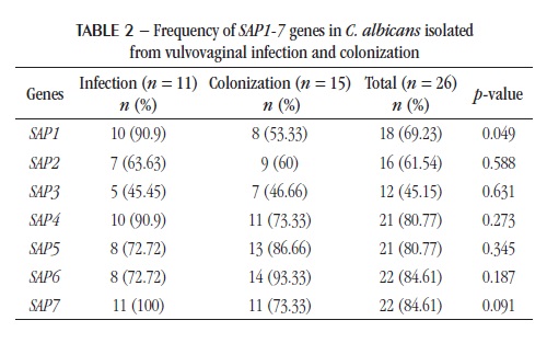 Results: The most frequent gene in C. albicans isolated from colonization was SAP6 (93.33%), and from infection, SAP7 (100%). We observed a statistical difference (p = 0.049) in SAP1 gene frequency between isolates from vulvovaginal colonization and infection.