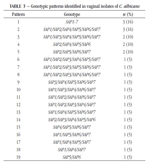 Materiais e método: O estudo incluiu 26 isolados vaginais de C. albicans. Os genes de aspartil proteases (SAP1-7) foram detectados por reação em cadeia da polimerase (PCR).