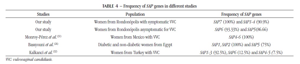 In this study, we observed that the most prevalent SAP genes in C. albicans isolated from vulvovaginal infection and colonization were SAP7 (100%) and SAP6 (93.33%), respectively. Monroy-Pérez et al. (2013)(31) determined the frequency and the expression of SAP1-10 genes isolates from women with VVC in Mexico and identified that SAP4-6 genes were the most frequent (100%), besides observing that all SAP genes were expressed in a model of reconstituted human vaginal epithelium (RHVE), suggesting that aspartyl proteases play an important role in the pathogenesis of the infection. Bassyouni et al. (2015)(26) investigated the presence of SAP1-8 genes in C. albicans isolated from vaginal mucosa of diabetic and non-diabetic women and identified that SAP1 and SAP2 were the most frequently detected genes, followed by SAP5 in both groups; there was no difference in the distribution of genes between diabetic and non-diabetic women. Kalkanci et al. (2005)(32) verified that SAP1-3 genes were the most prevalent in vaginal isolates of C. albicans, with a 92.5% rate, followed by SAP6, with 12.5%, and SAP4-5, with 7.5%.