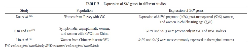 A study of genic expression of C. albicans revealed that SAP1, SAP3, and SAP6-8 genes are related with active VVC. Moreover, SAP1 and SAP3 are preferably expressed in the vaginal mucosa, when compared with the oral infection, indicating that the differential expression of genes encoding hydrolytic enzymes varies according to the phase of the disease and the anatomical location(18). Lian and Liu (2007)(43) evaluated the expression of SAP1-7 genes in C. albicans isolated from asymptomatic women, and women with symptomatic and recurrent VVC. The authors observed that the transcripts for SAP1 and SAP3 genes were present only in isolates of VVC and RVVC. Lin et al. (2007)(44) determined by real-time PCR (RT-PCR) that SAP2 and SAP5 were the most commonly expressed genes in the vaginal mucosa of women with acute VVC. The expression of SAP genes in the different studies is shown in Table 5.