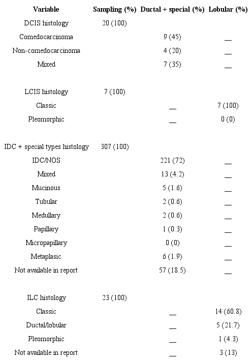 In the whole sample 27 (7.5%) cases of carcinoma in situ were found, of which 20 ductal tumors (74%) and seven (26%) lobular tumors. Whereas the invasive carcinomas totaled 330 cases (92.4%), of which 221 (66.9%) were IDC/NOS, 29 (8.7%) belonging to the special types, 23 (6.9%) lobular and 57 (17.2%) with no classification available in the report (Table 1).