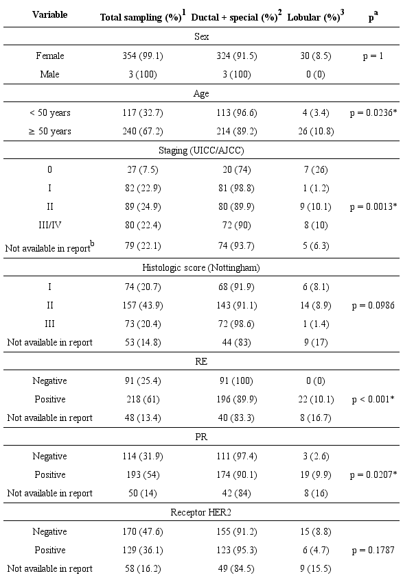 Results: Three hundred twenty-seven (91.6%) cases of ductal/special types carcinoma and 30 (8.4%) cases of lobular carcinoma were diagnosed, totaling 357 samples. From these cases, 27 (7.5%) were carcinoma in situ (20 ductal and seven lobular) and 330 (92.4%) were invasive carcinoma (307 invasive ductal/special types and 23 lobular). The prevalence of breast cancer among women was 991% and the majority of patients were older than 50 years of age (67.2%). Regarding the União Internacional de Controle do Câncer/American Joint Committee on Cancer (UICC/AJCC) staging, 49.2% of the ductal/special types tumors were diagnosed in Stages I or II, while 56.6% of lobular carcinomas were diagnosed in Stages II or III/IV. Regarding the Nottingham score, most cases were intermediate grade (43.9%). A total of 61% of the tumors were estrogen receptor positive (ER+) and 54% were progesterone receptor positive (PR+). Moreover, 36.1% presented positive human epidermal growth factor receptor 2 (HER2+), a rate higher than that indicated by the literature.