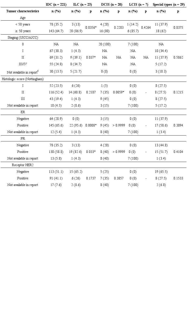 The clinicopathological variables were sex, age, tumor staging (UICC/AJCC), histological grade or Nottingham Histologic Score System (SBR), presence of the ER, PR and HER2 hormonal markers. The cases with incomplete reports and/or variables not available, did not entered in the statistical analysis. The statistical relationship between the data and the histological classification was assessed using the chi-square test (x2) and/or Fischer's exact test using the GraphPadPrism 5.1 software.