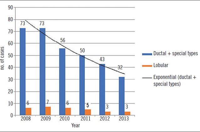 Therefore, the objective of this study was to carry out a survey of the cases of ductal, special types and lobular breast carcinomas diagnosed at the Clinical Hospital of the Federal University of Paraná [Hospital de Clínicas da Universidade Federal do Paraná (HC-UFPR)] in the 2008-2013 period and to compare them with the literature.