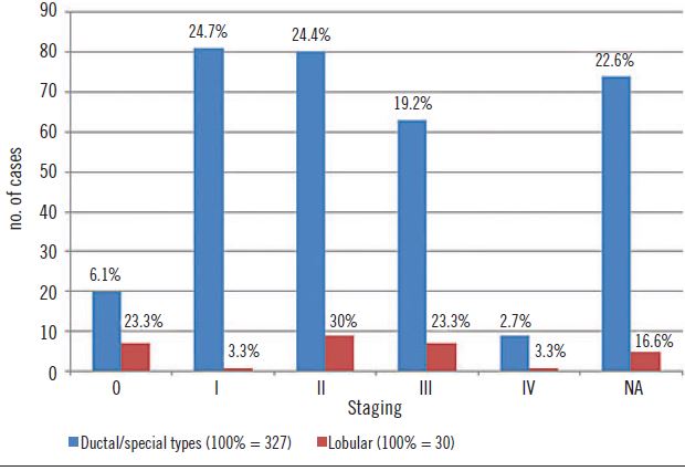 Método: El perfil de los carcinomas de mama diagnosticados en un hospital terciario de Curitiba ha sido comparado con aquel de la literatura, a través de análisis retrospectivo de historias de carcinoma de mama ductal/tipos especialesy lobulillar de pacientes atendidos entre los anos de 2008y 2013.