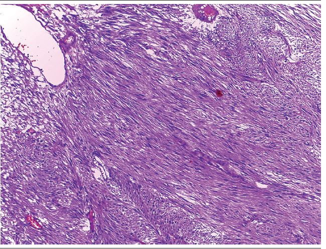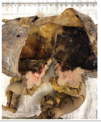 A 65-year-old male patient presented a mass in the proximal ileum found during exploratory laparotomy. Tumor resection was performed with free surgical margins; the material was submitted to pathological anatomy examination whose macroscopy revealed a tumor lesion measuring 13.5 × 13 × 8.5 cm, and sections showed a cystic lesion with a white solid area and a necrotic component in the wall, draining hemorrhagic fluid (Figure 1). Microscopy revealed a tumor with spindle cells, elongate nuclei, abundant cytoplasm, marked congestion and necrosis (Figure 2). The anatomopathological diagnosis was GIST, confirmed by immunohistochemistry (CD117).
