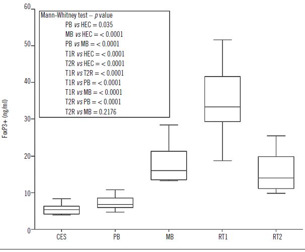 The plasma FoxP3 concentration (in the absence of stimulation) and in the peripheral blood mononuclear cell cultures (PBMC) supernatants, stimulated with the M. leprae sonicated antigen (MLSA), was determined by ELISA with the human FoxP3 kit, according to the manufacturer’s instructions (LifeSpan BioSciences - Seattle). Cultures with PBMC were prepared according to protocol set forth in Chaduvula et al. (2012)(9). The statistical analysis was performed with Graphpad Prism v.5. Mann-Whitney test was used for comparison between two groups of patients.