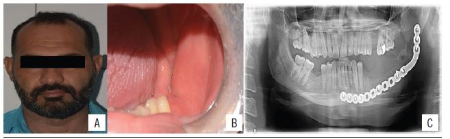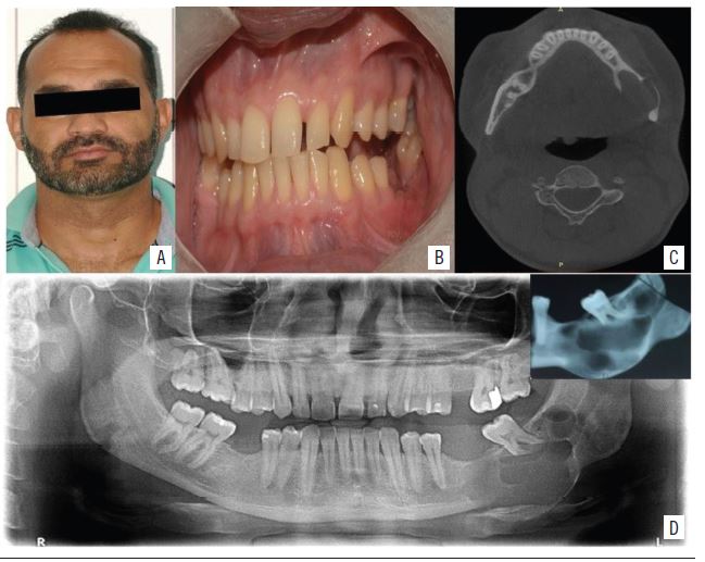 A 36-year-old mixed-race male patient searched for the service of Oral Maxillofacial Surgery and Traumatology of Universidade Federal do Rio Grande do Norte (UFRN) complaining of pain during masticatory movements in the posterior region of the left mandible. Clinical examination showed accentuated mobility of the second lower left molar and slight volume increase in left mandible region, with no intraoral volumetric changes (Figure 1 A and B). The panoramic imaging examination also considered multilocular radiolucent osteolytic lesion, with cortical basilar expansion, root resorption of the second left lower molar and involvement of body, angle and ramus of the left mandible (Figure 1C).