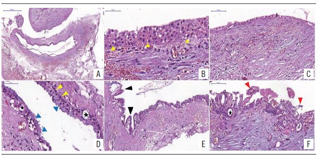 After clinical and radiographic analysis, incisional biopsy was conducted on an outpatient basis. The material was referred to histopathology at the department of Pathology of UFRN. The anatomopathological examination revealed fragments of cystic lesion of odontogenic nature, characterized by multiple cystic compartments lined by epithelium, now exhibiting flat squamous cells, now cuboidal cells of variable thickness. The layer of luminal cells shows low columnar cells, sometimes referred to as hobnail cells. Mucous cells are present, as well as microcystic spaces, tuft-like papillary projections, cells with apocrine secretion and foci of epithelial thickening. The capsule of dense fibrous connective tissue shows congested vessels and areas of hemorrhagic leakage. For the above reasons, the anatomopathological diagnosis of GOC was established (Figure 2).