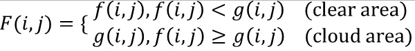 Using high-pass filtering to reduce the brightness value is the basic principle of haze removal with HF. But the DN value in cloudless areas has been modified as well. A simple processing is to use the DN value of the original image as the judgment condition for per-pixel replacement. The DN value of the original image and the processed image is expressed in f(i, j) and g(i, j), respectively, and the DN value after dealing with the pixel replacement, is expressed in F(i, j).