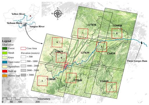 As one of the most important ecological function zones, the study area is located on the upper reaches of the Three Gorges Reservoir Area (TGRA), where breeds the largest water conservation project in the world. The status of the landscape structure and ecological function here has direct impacts on TGPA. Eight case areas (figure. 1) were selected for the case studies because of their certain haze contamination images with high quality of corresponding reference images (non-haze contamination). Moreover, these areas are regarded as the places which are hard to be accurately characterized in the world with the heterogeneity and fragment of landscape. Thus, these areas served as important case studies for testing algorithms to monitor haze removal and their impacts on classification.