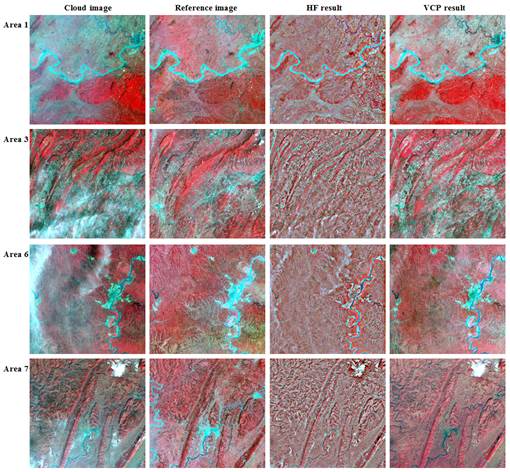 From an inspection of the results (figure 3), most of haze, including some thin clouds, had been well removed in the both processed results (HF and VCP results) and their differences were obvious, particularly over the area 3 and 6. Note that the color of the corrected image looked distorted from the original image because of the image enhancement processing for visualization to a great extent. By comparing the VCP results with HF results, the VCP visually appeared to remove more thin cloud and to be more similar to the reference images. The spectrum and texture features of VCP results mostly were in accordance with the reference data, despite of some noticeable excessive processing parts.