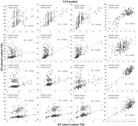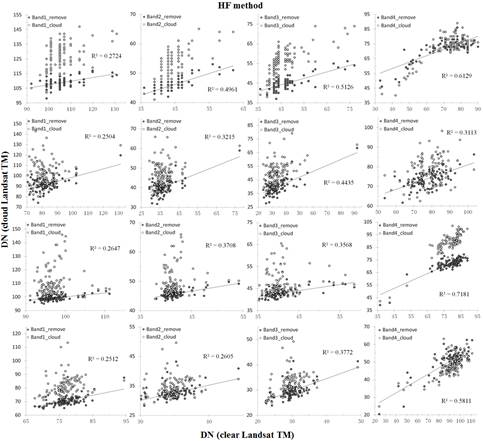In order to assess the effectiveness of the algorithms in recovering the true spectral information under haze, and improving their accuracy rigorously, one common method used to quantitatively evaluate the reliability of the results is the comparison of the image from overlapped region with clear image (spectral matched reference image). The statistical results for the haze image (before and after haze removal) against the reference image are shown in figure 4 and figure 5. After haze removal, the squared correlation coefficient (R2) for each band between the de-hazed image and clear image became greater than 0.25 (HF) and 0.40 (VCP), respectively, which is much better than that before haze removal. It is clear that de-hazed technique can ameliorate the hazy Landsat TM images significantly. However, there exist differences between the two algorithms. The R2 for each band based on the VCP are greater than the results by the HF, implying that the VCP is superior to the HF.